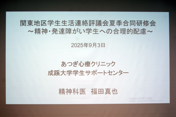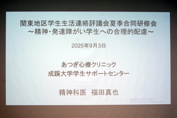 初日には、『「精神・発達障がい学生への合理的配慮」について』を演題に、あつぎ心療クリニック外来診療、うつ病リワーク担当医/明治大学精神科産業医/成蹊大学学生サポートセンター 福田真也様より、約1時間30分にわたり、ご講演をいただきました。