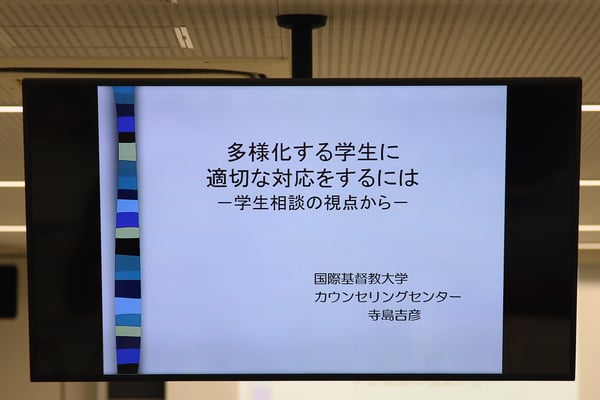 初日には、「多様化する学生に適切な対応をするには-学生相談の視点から-」を演題に、国際基督教大学カウセンリングセンター長で関東地区学生相談研究会会長である寺島吉彦様より、約1時間30分にわたり、ご講演をいただきました。